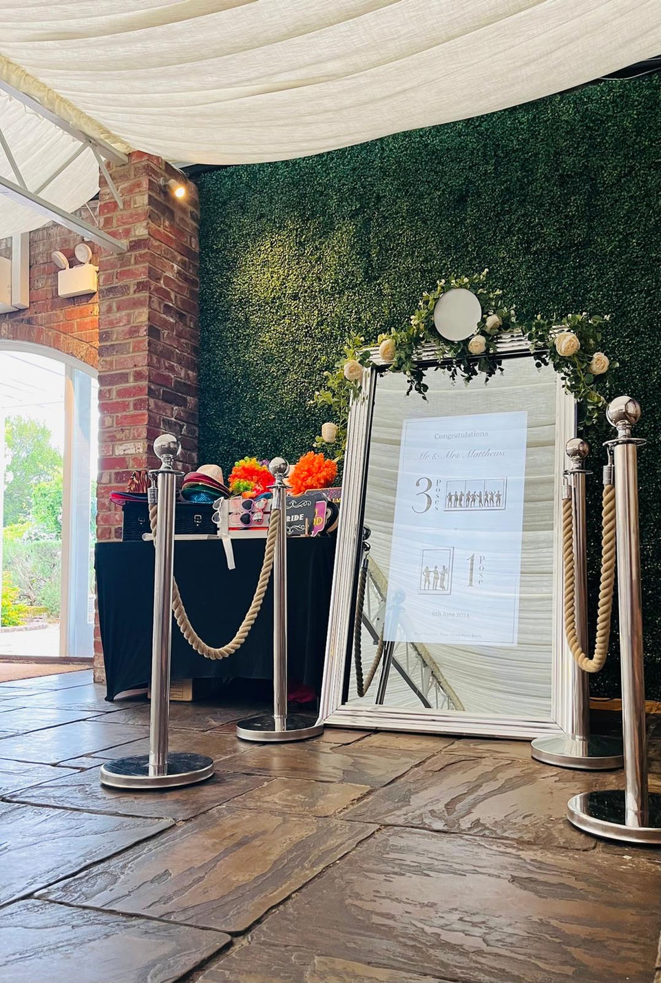 You choose how you'd like to dress the mirror. We have Red Carpet and Ropes, Rustic or none, and a choice of Garland. You can request the backdrop too - we have a silver sequin sparkkle option.